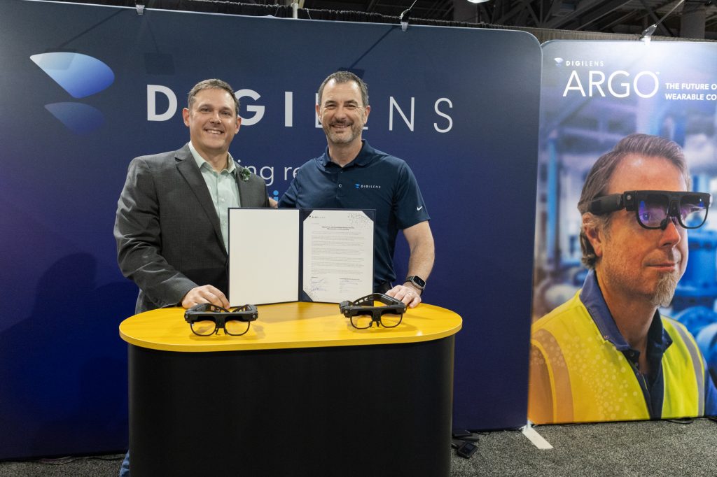 Consolidated Nuclear Security and DigiLens signed a memorandum of understanding with DigiLens to collaborate on advanced augmented, mixed, virtual, and extended reality technologies in waveguides and heads-up displays. In the photo from left are Ashley Stowe, director of the Oak Ridge Enhanced Technology and Training Center for Consolidated Nuclear Security at the Y-12 National Security Complex, and Chris Pickett, DigiLens CEO.